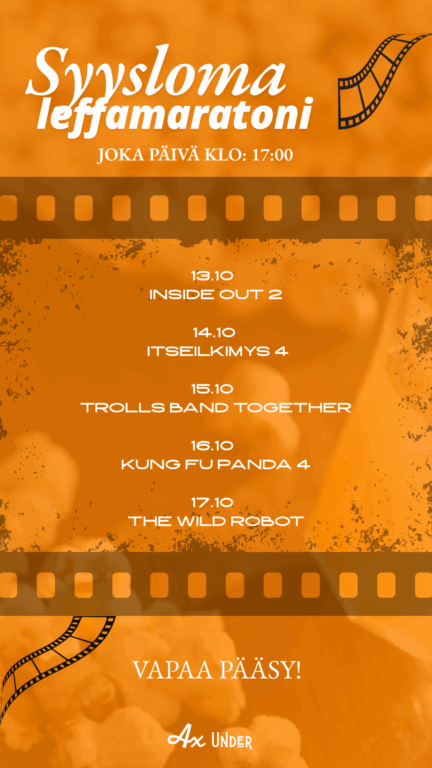Ei haittaa vaikka sataisi koko viikon sillä Syysloma viikolla AX:ssa pyörii joka päivä lasten leffa klo: 17.00!